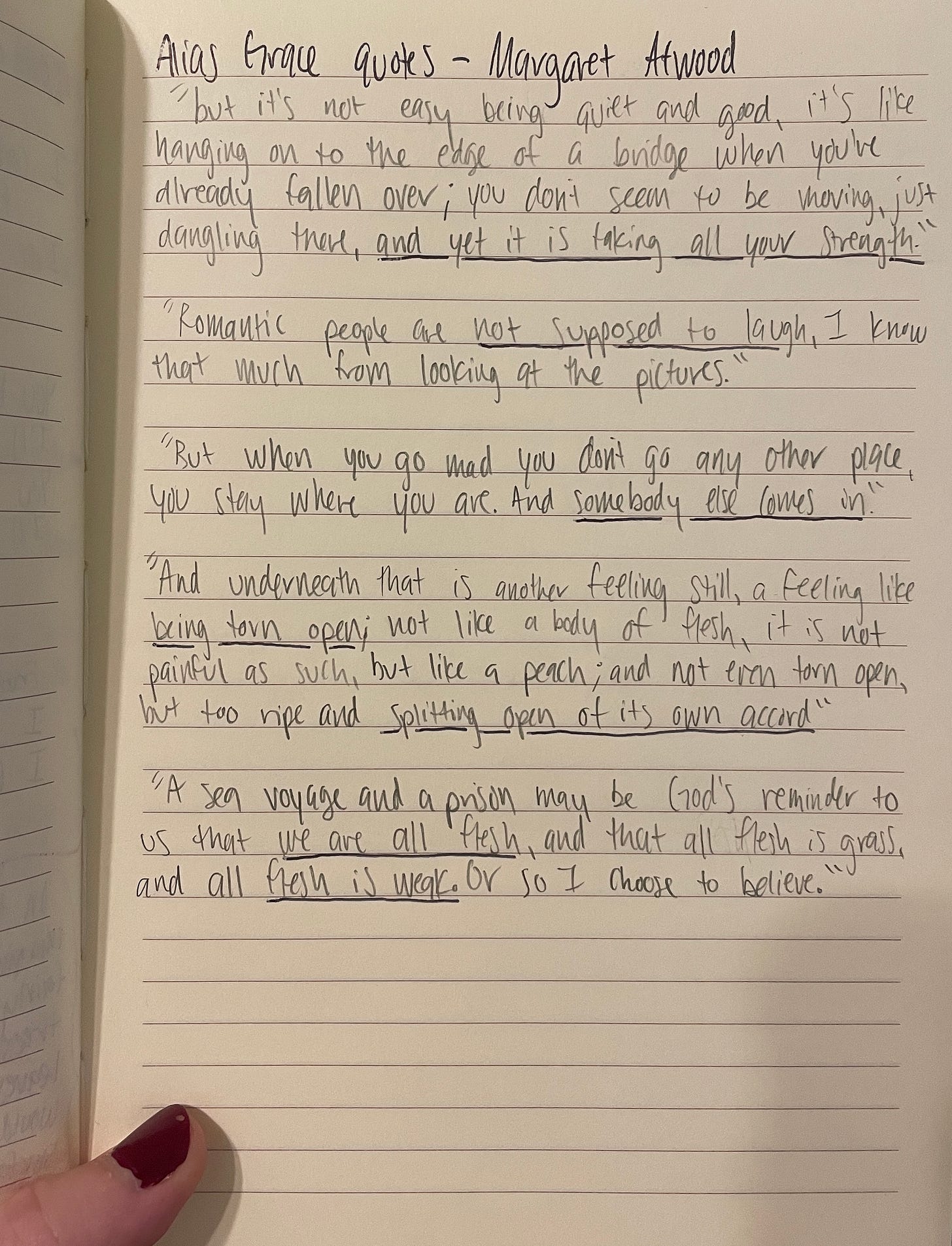 This will help with less scrolling as well, but I think it would be good to put more conscious effort into journaling. It can be helpful when I’m stressed, and sometimes I come up with surprising things when I just start physically writing. Also, annotating books can make them more fun to read. I usually avoid it because it can make reading more time consuming, but certain books just go down easier if you talk to the text a little more. I’m currently reading a book on my laptop because I couldn’t find a cheap version irl (I usually hate reading ebooks but I was desperate), and being able to quickly annotate has made me realized it’s kinda fun.